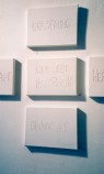 unregelmäßig gesetzte Kreuzstiche mit Rosenbinder eine derbe Struktur. Wackelige Buchstaben formen Worte, die wie unumstößliche Statements ihre Botschaft von der Leinwand in die Welt hinaus schreien.
